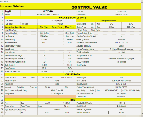 - Data Sheets/Specifications for Instruments, Control Valves, Safety Valves